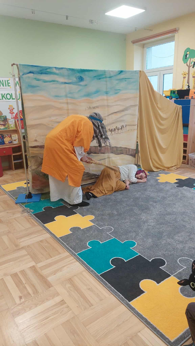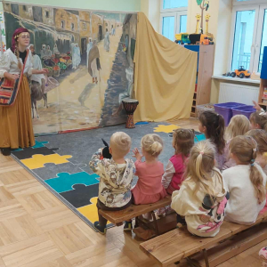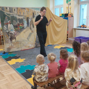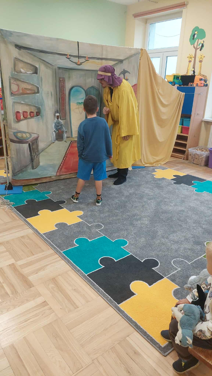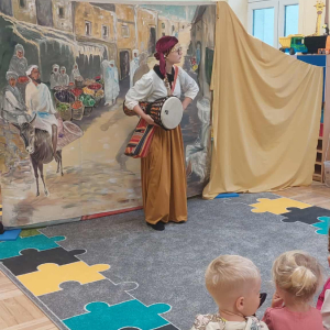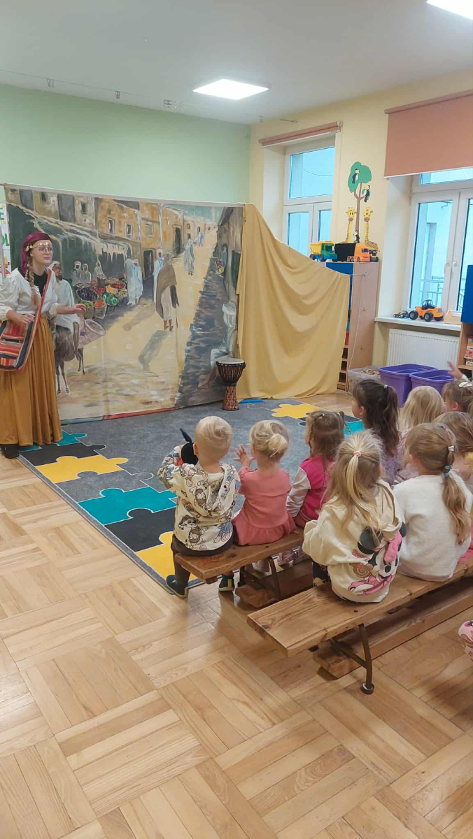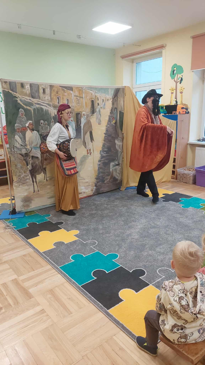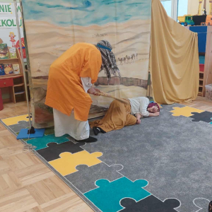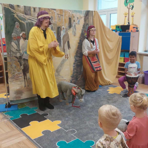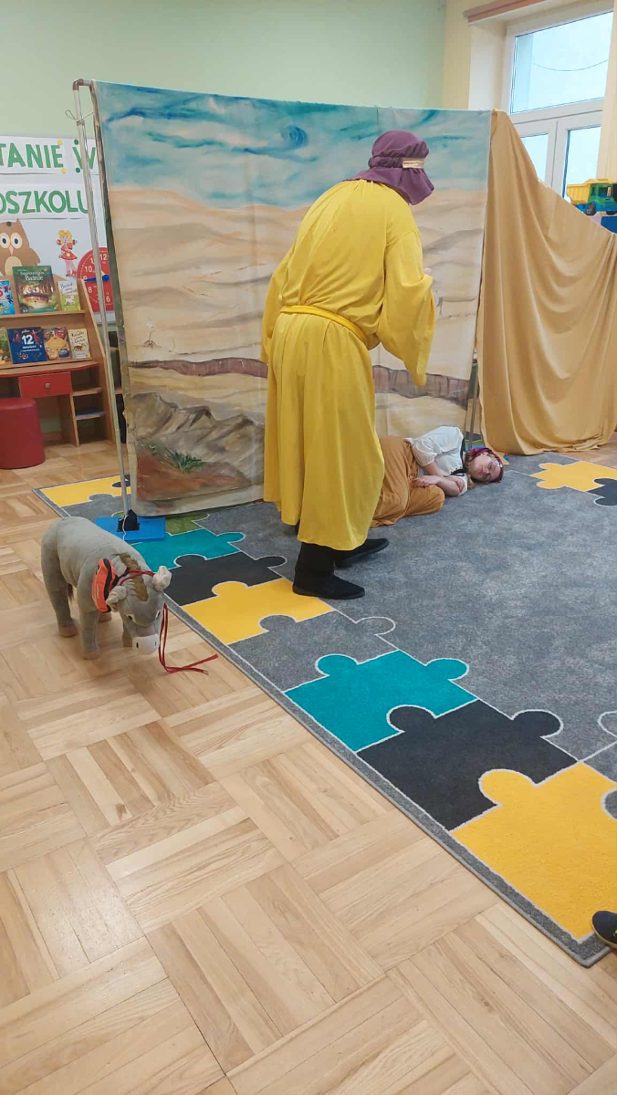Dnia 23 września do naszego przedszkola przyjechał teatrzyk EDEN z Wadowic. Wspólnie z 1 klasą obejrzeliśmy historię pewnego starożytnego miasta, gdzie spotkaliśmy sympatyczną kupczyni o imieniu Hula Hop handlującą na tutejszym targu. Niestety na jej drodze staje złodziej, który pozbawia ją dobytku i porzuca na pustyni. Przechodzący obok ludzie zajęci swoimi sprawami są wobec niej obojętni. Nagle zjawia się samarytanin, który pomaga kobiecie. Dzieci obserwując zachowanie bohaterów dowiedziały się, że warto jest pomagać potrzebującym i na czym polega bezinteresowność. Aktywnie uczestniczyły w przedstawieniu: grając na instrumentach, udzielając pierwszej pomocy, jeżdżąc na osiołku i odpowiadając na zadawane przez aktorów pytania. Bardzo dziękujemy za przybycie i nie możemy się doczekać kolejnego występu.