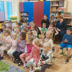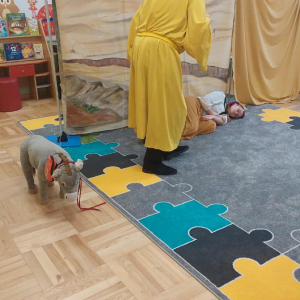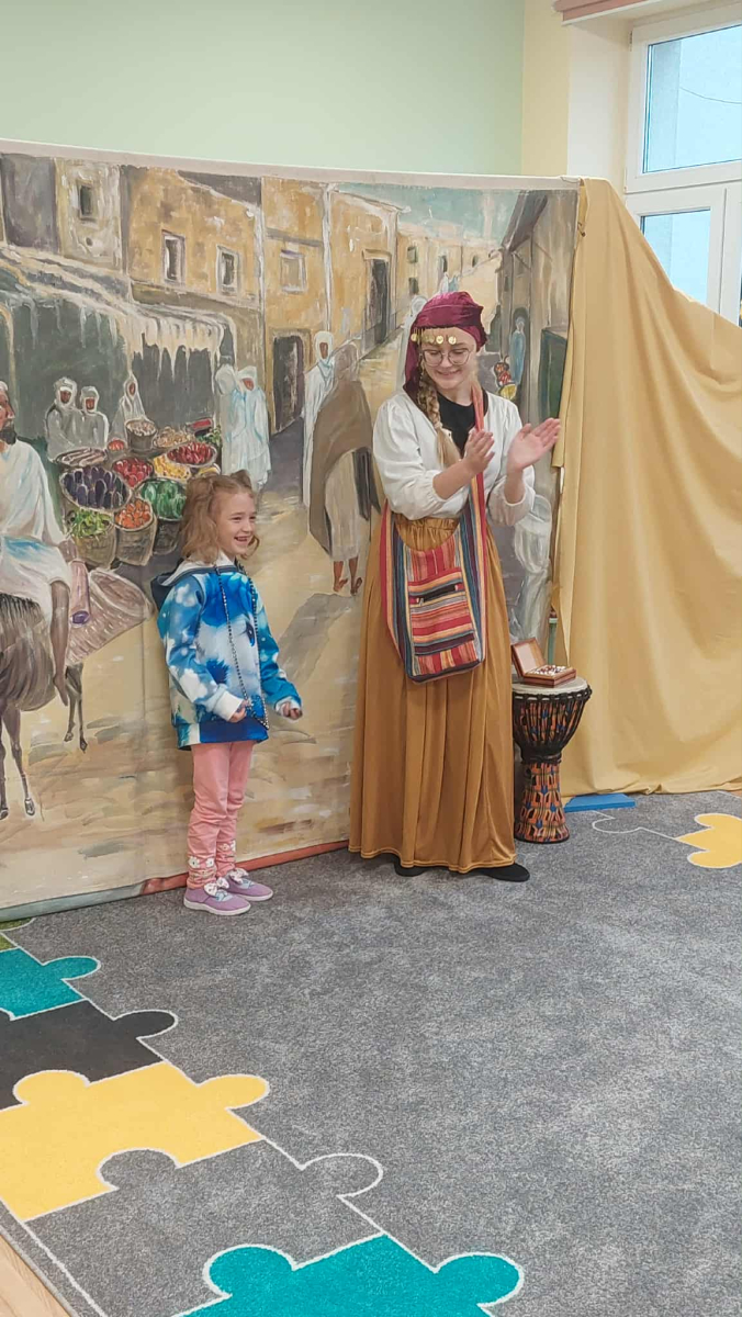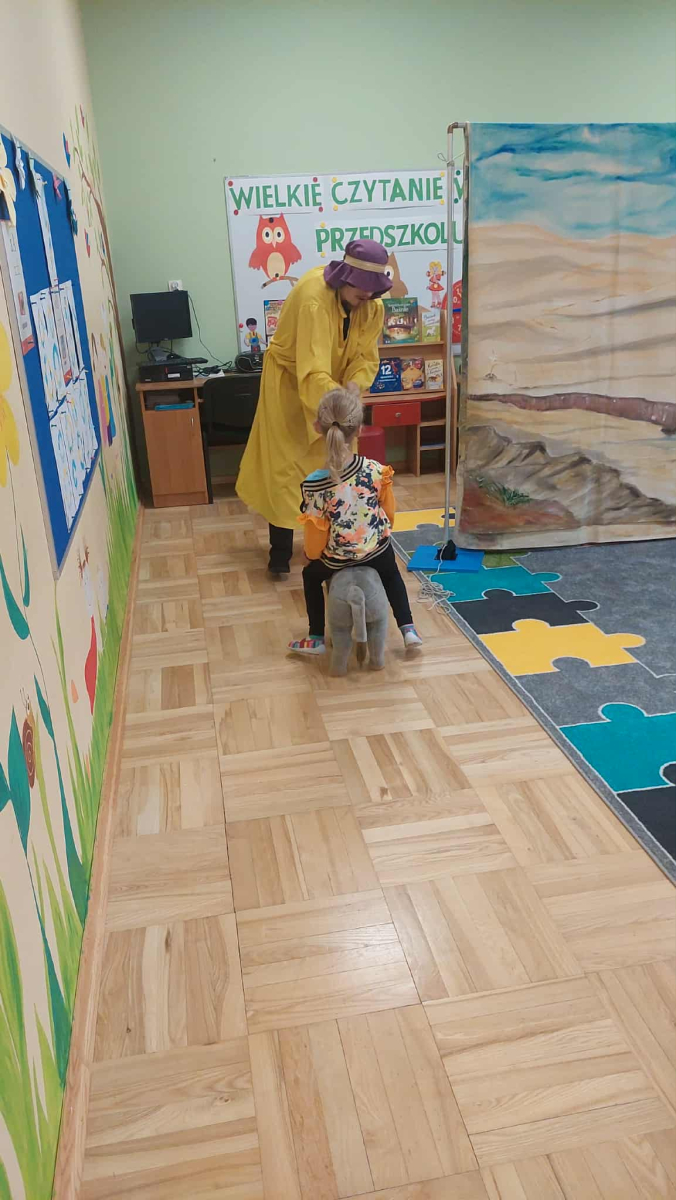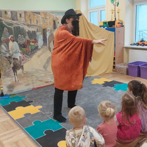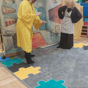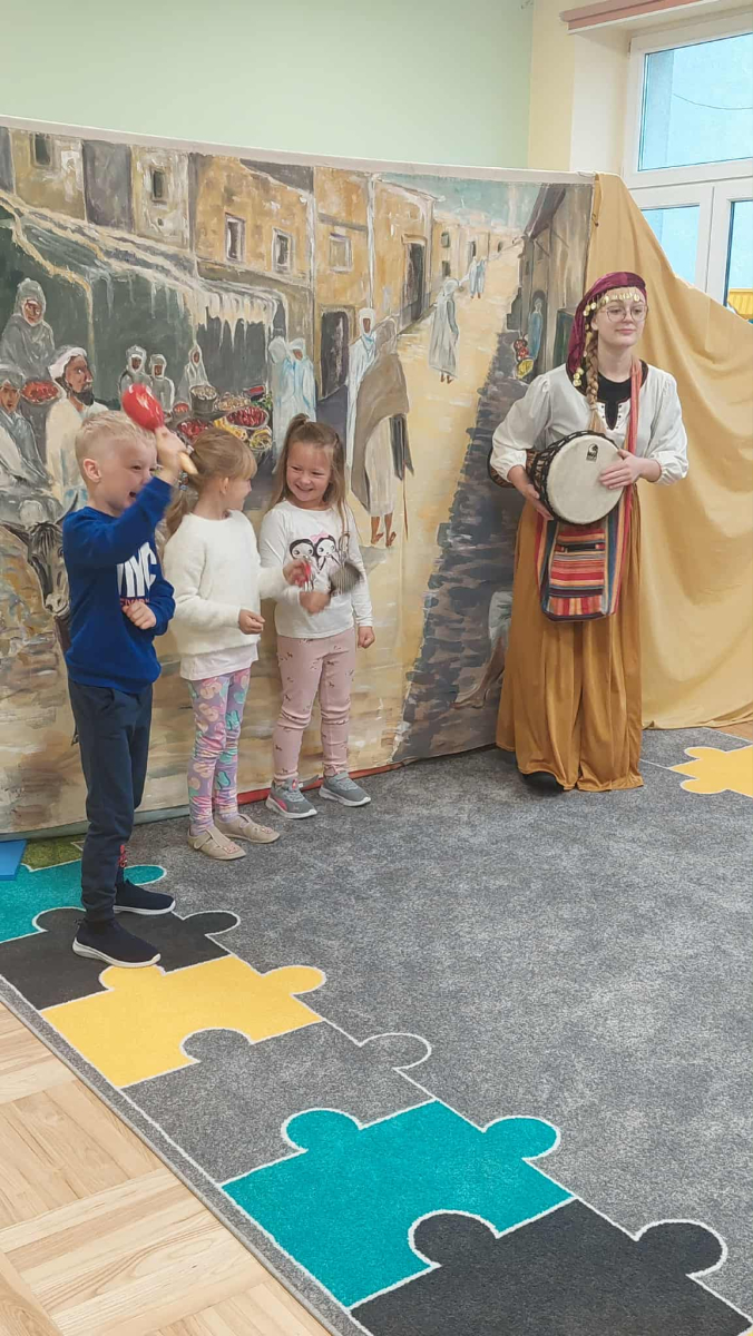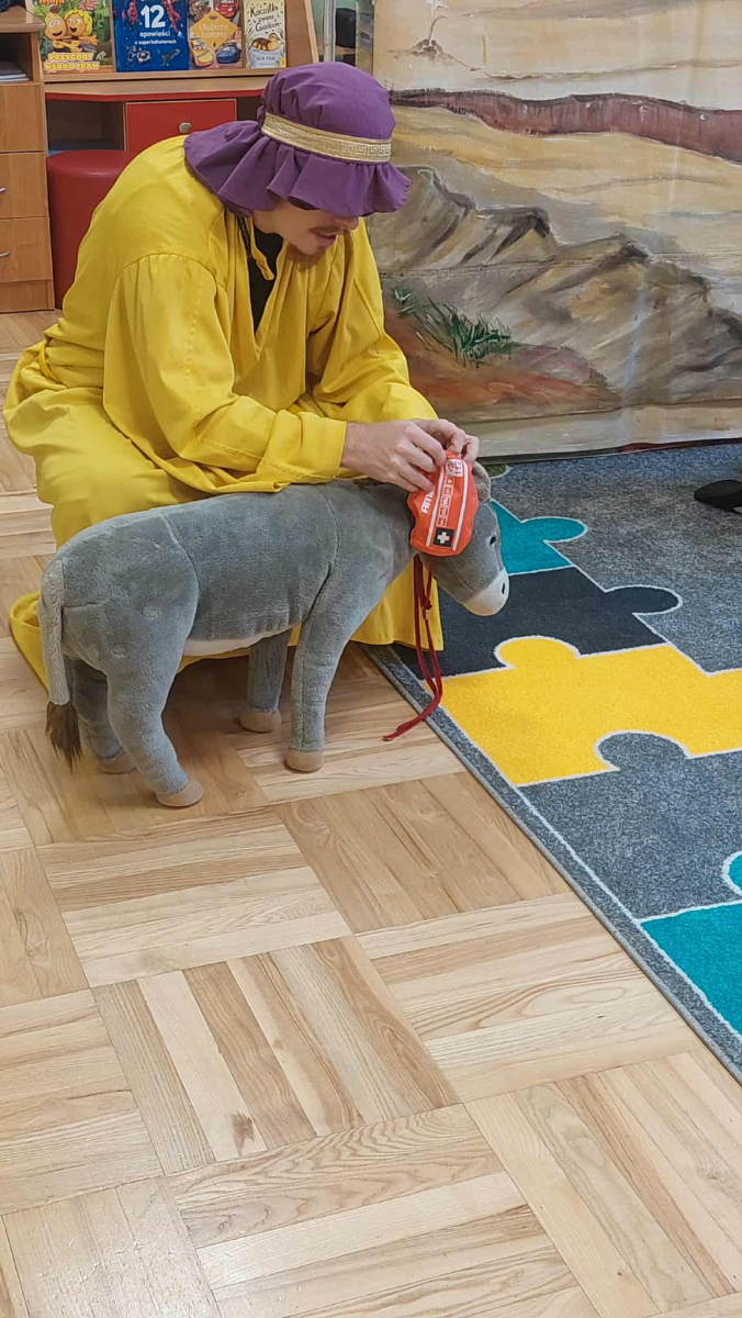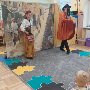 Dnia 23 września do naszego przedszkola przyjechał teatrzyk EDEN z Wadowic. Wspólnie z 1 klasą obejrzeliśmy historię pewnego starożytnego miasta, gdzie spotkaliśmy sympatyczną kupczyni o imieniu Hula Hop handlującą na tutejszym targu. Niestety na jej drodze staje złodziej, który pozbawia ją dobytku i porzuca na pustyni. Przechodzący obok ludzie zajęci swoimi sprawami są wobec niej obojętni. Nagle zjawia się samarytanin, który pomaga kobiecie. Dzieci obserwując zachowanie bohaterów dowiedziały się, że warto jest pomagać potrzebującym i na czym polega bezinteresowność. Aktywnie uczestniczyły w przedstawieniu: grając na instrumentach, udzielając pierwszej pomocy, jeżdżąc na osiołku i odpowiadając na zadawane przez aktorów pytania. Bardzo dziękujemy za przybycie i nie możemy się doczekać kolejnego występu.