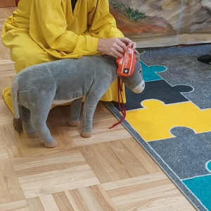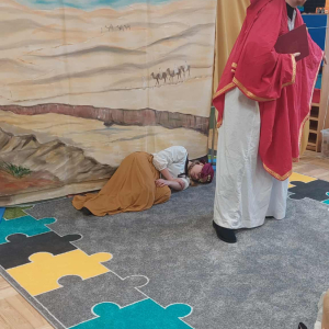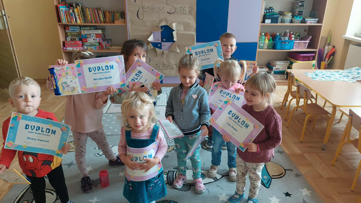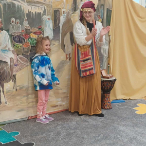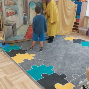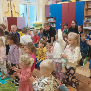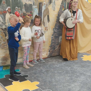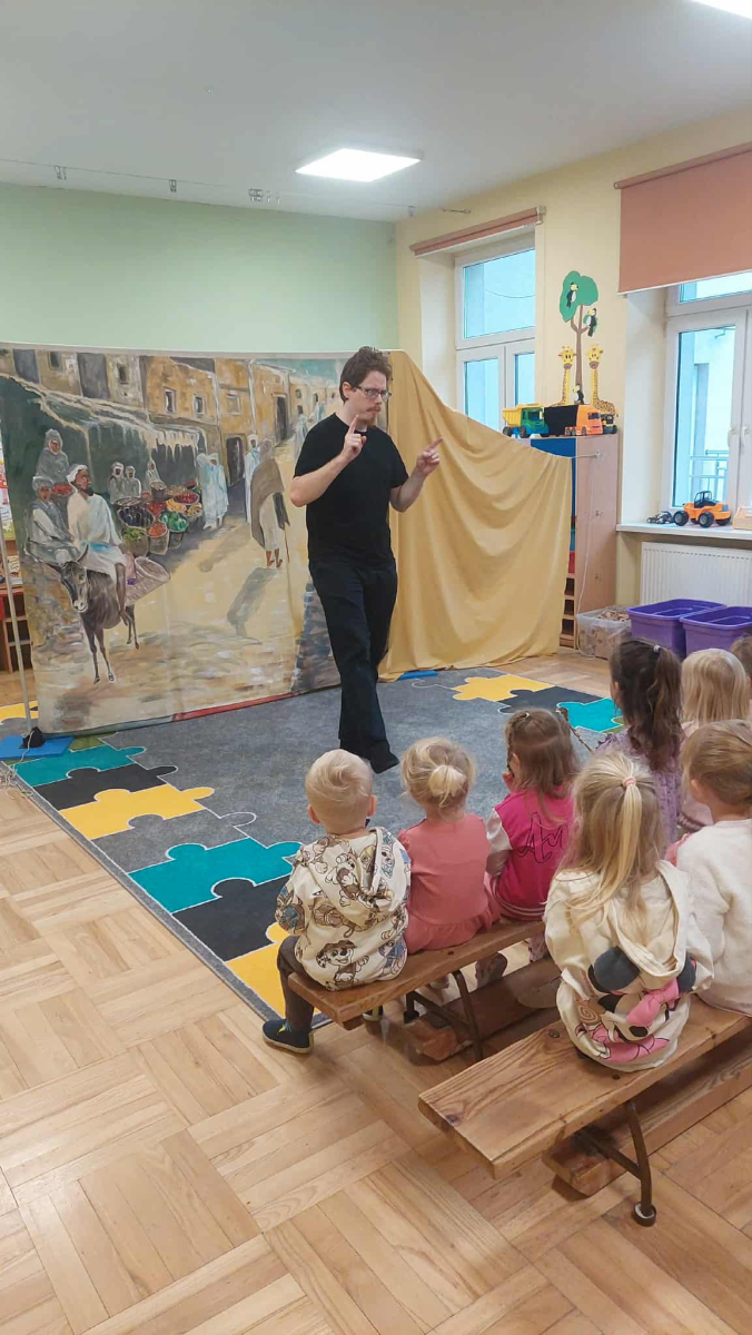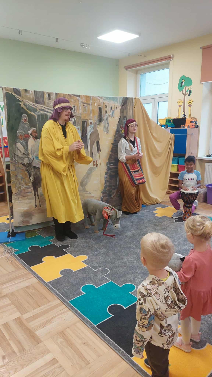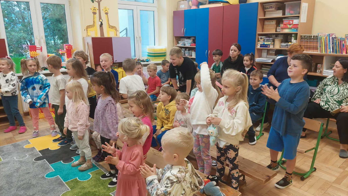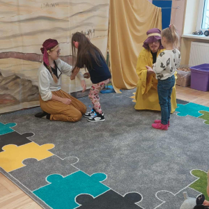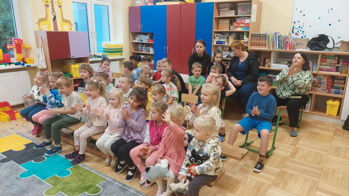 Dnia 23 września do naszego przedszkola przyjechał teatrzyk EDEN z Wadowic. Wspólnie z 1 klasą obejrzeliśmy historię pewnego starożytnego miasta, gdzie spotkaliśmy sympatyczną kupczyni o imieniu Hula Hop handlującą na tutejszym targu. Niestety na jej drodze staje złodziej, który pozbawia ją dobytku i porzuca na pustyni. Przechodzący obok ludzie zajęci swoimi sprawami są wobec niej obojętni. Nagle zjawia się samarytanin, który pomaga kobiecie. Dzieci obserwując zachowanie bohaterów dowiedziały się, że warto jest pomagać potrzebującym i na czym polega bezinteresowność. Aktywnie uczestniczyły w przedstawieniu: grając na instrumentach, udzielając pierwszej pomocy, jeżdżąc na osiołku i odpowiadając na zadawane przez aktorów pytania. Bardzo dziękujemy za przybycie i nie możemy się doczekać kolejnego występu.
