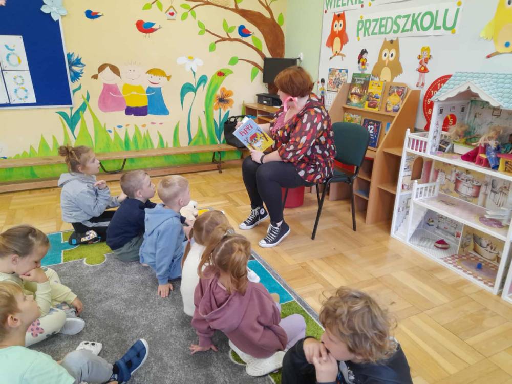 Pierwszym naszym gościem była pani Dorota Lenik, która wcieliła się w postać Pippi i zabrała dzieci w podróż do Skandynawii, czytając im komiks o najsilniejszej dziewczynce na świecie. Najwięcej radości sprawił dzieciom fragment o zabawie w berka. Pani Dorota odwiedzała nasze przedszkole co drugi piątek i czytała dzieciom takie książki jak: „Tupcio Chrupcio”, „Symfonia zwierząt” czy „Puk na tropie Smoka Wawelskiego”. Zachęcała również przedszkolaków do wypożyczania książek w Bibliotece Publicznej.