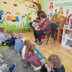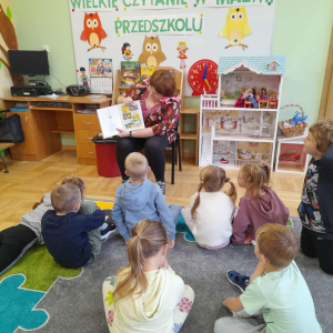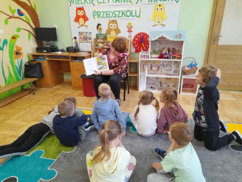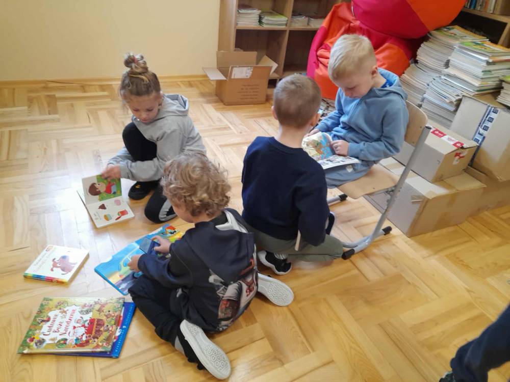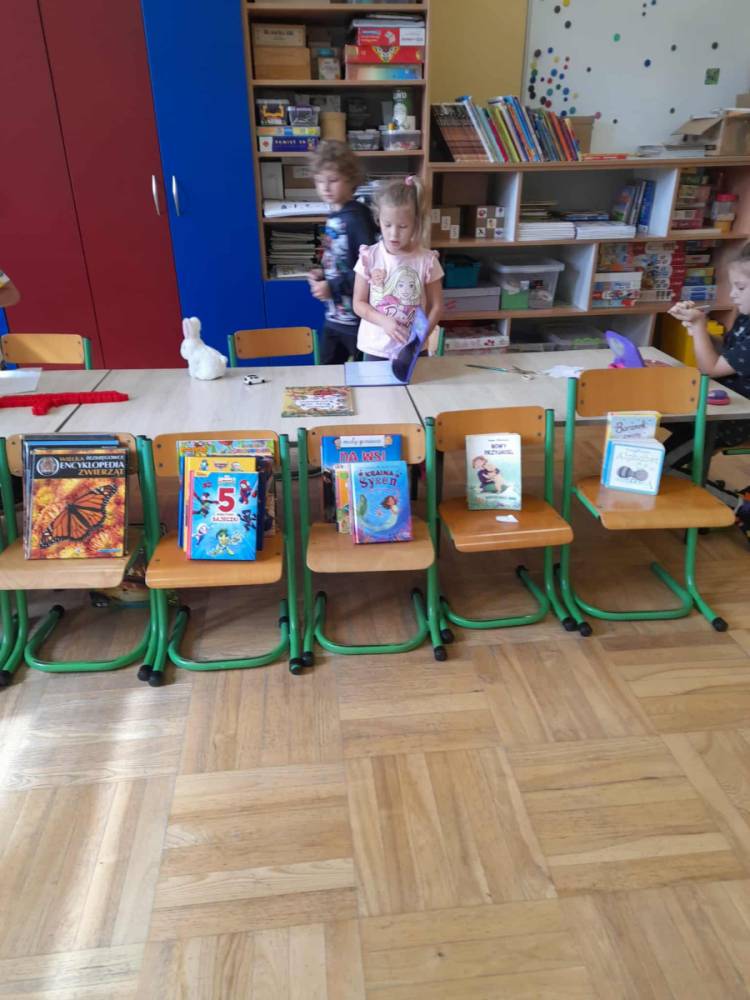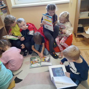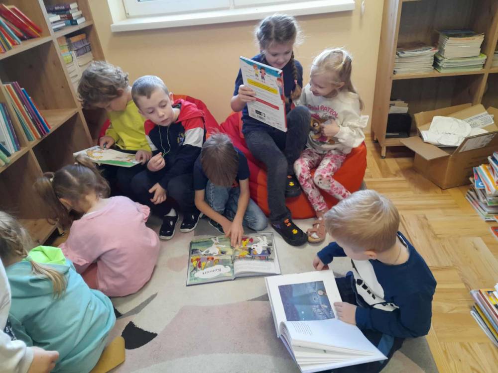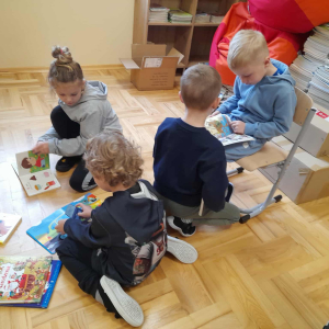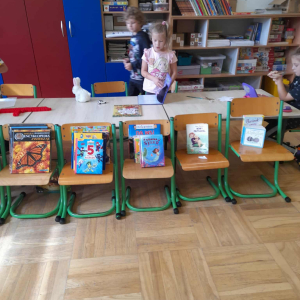 W każdą środę zapraszaliśmy do czytania rodziców – dotychczas odwiedziły nas trzy mamy. Codziennie przed śniadaniem lub obiadem czytaliśmy różne książki – bajki, baśnie, legendy, a także pozycje popularnonaukowe, np. o życiu pszczół czy jeży. Przedszkolaki bardzo chętnie wypożyczają książki ze szkolnej biblioteki i potrafią robić to samodzielnie, bez pomocy nauczyciela.