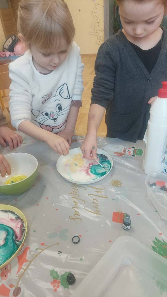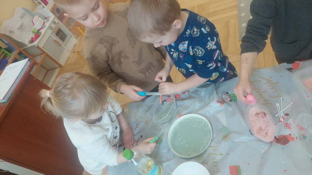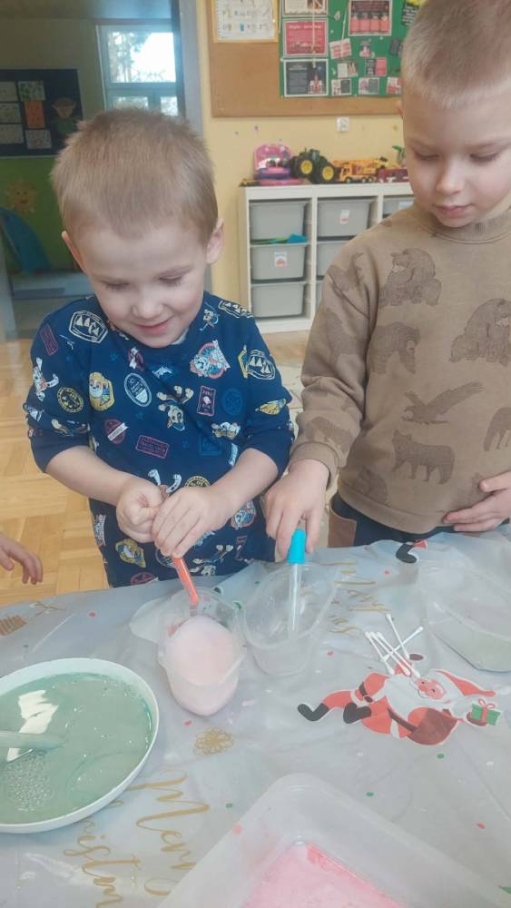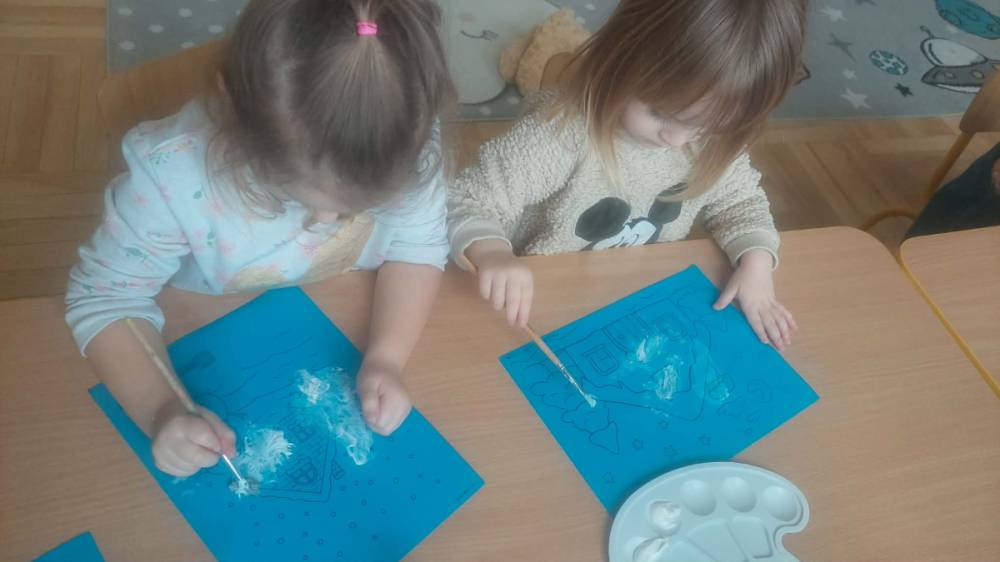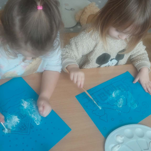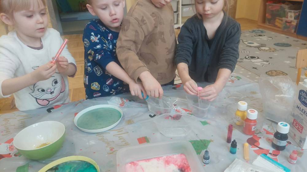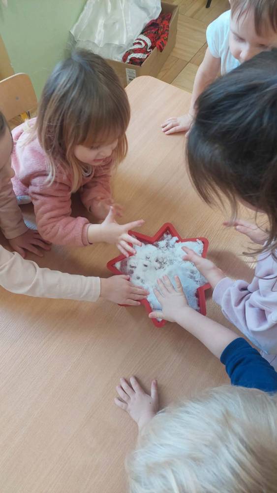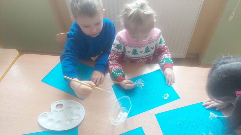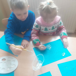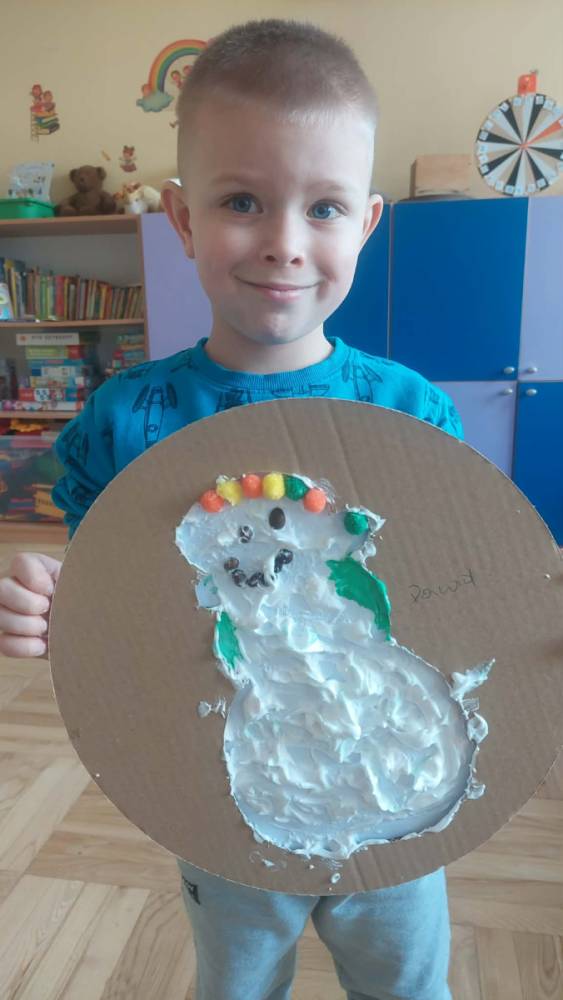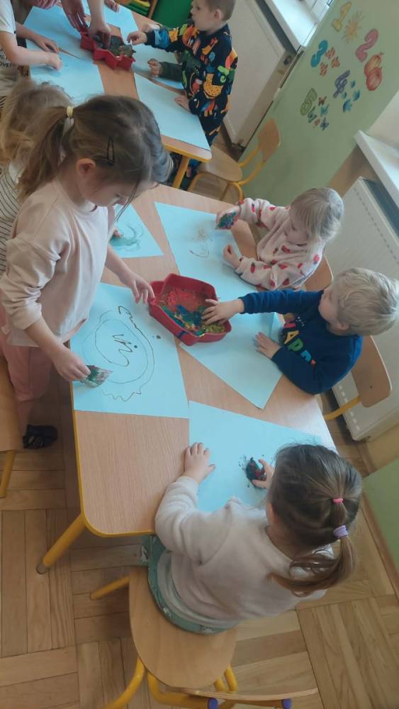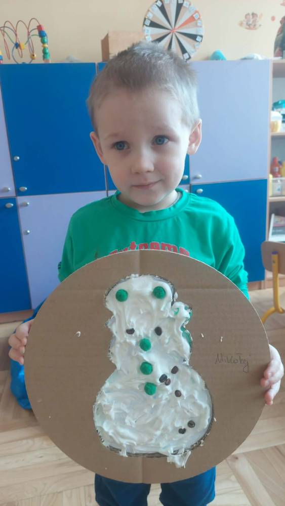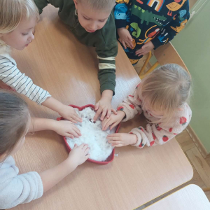 Styczeń był miesiącem, w którym nadal zajmowaliśmy się tematyką zimową. Dzieci dowiedziały się, że pasta do zębów nie służy jedynie do ich mycia, ale można dzięki niej tworzyć fantastyczne zimowe obrazy. Z pianki do golenia wykonaliśmy śnieżne bałwany, a przy użyciu lodu próbowaliśmy malować rysunki na kartce. Największym zainteresowaniem cieszyło się samodzielne wykonanie piasku kinetycznego z naturalnych składników.