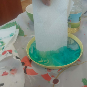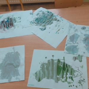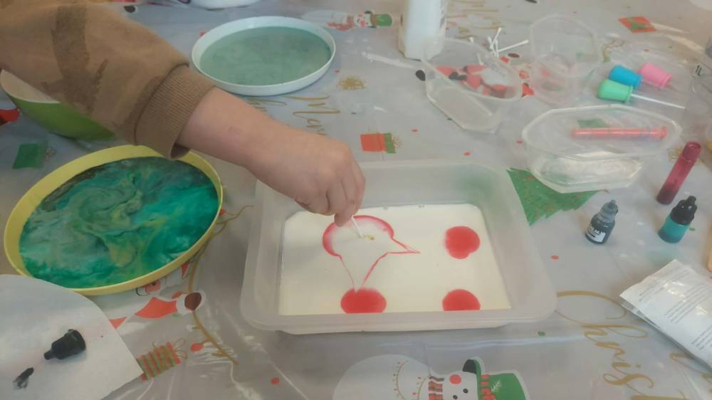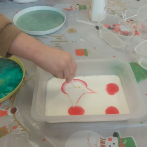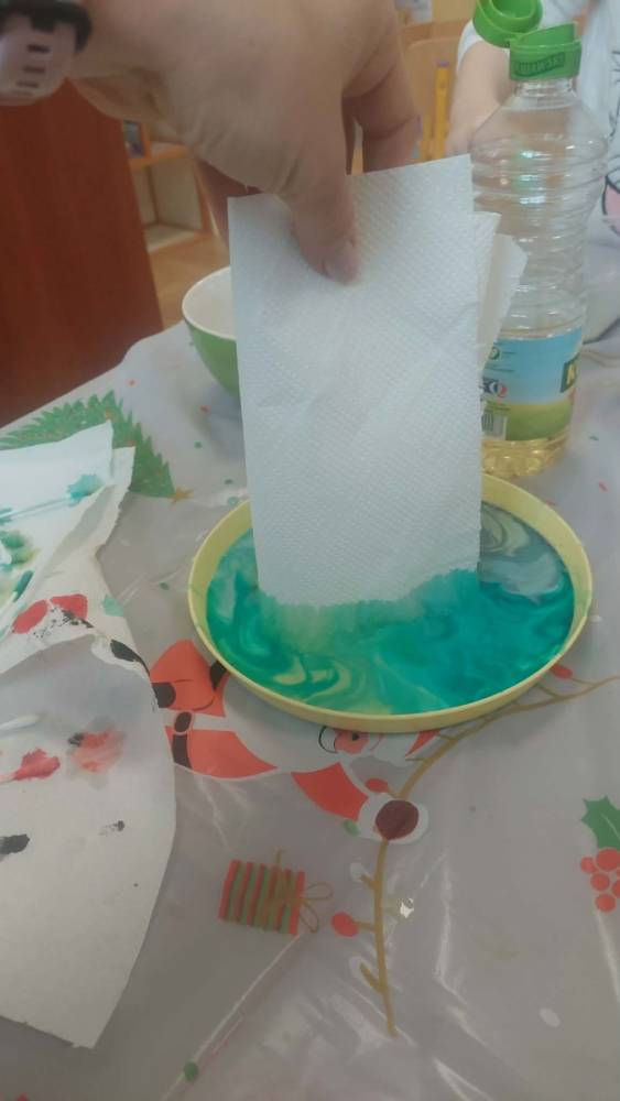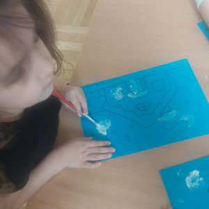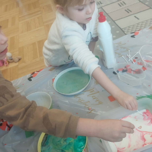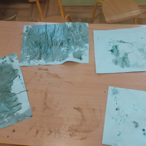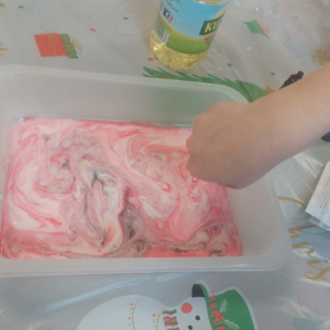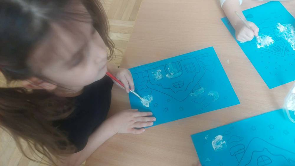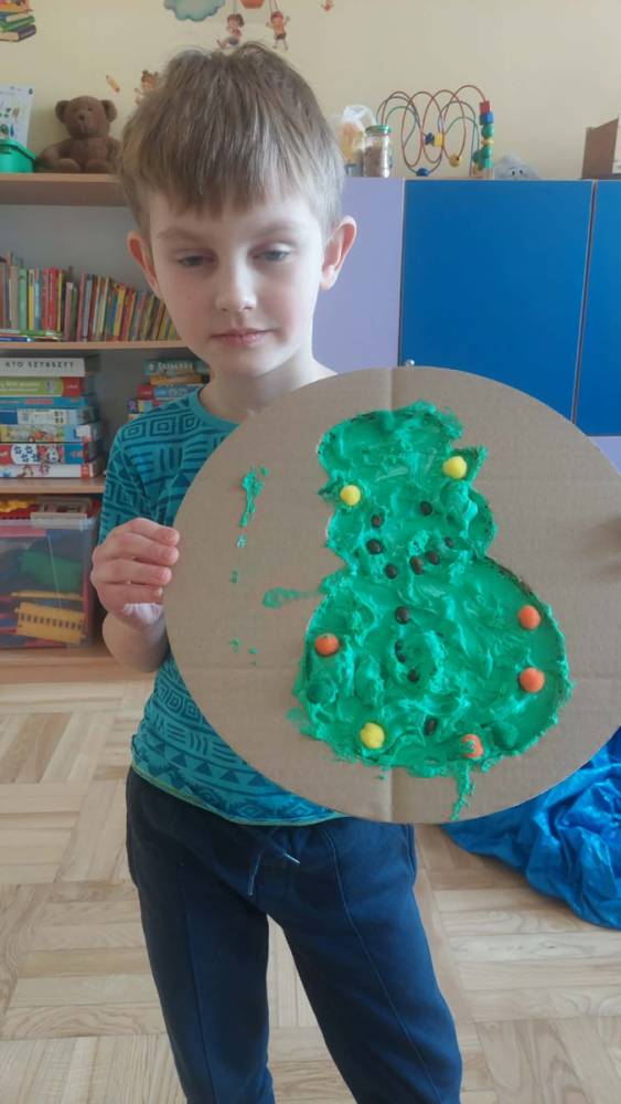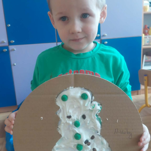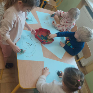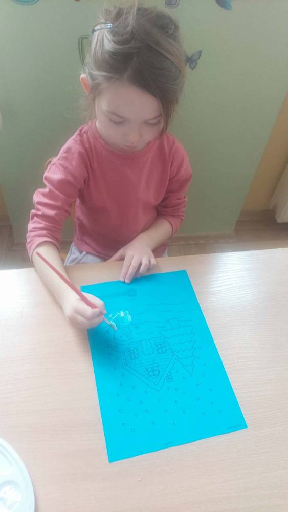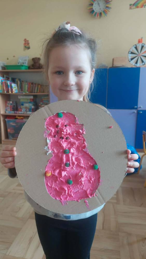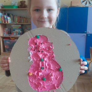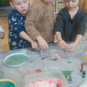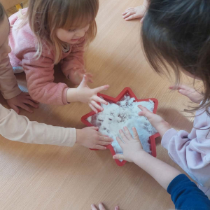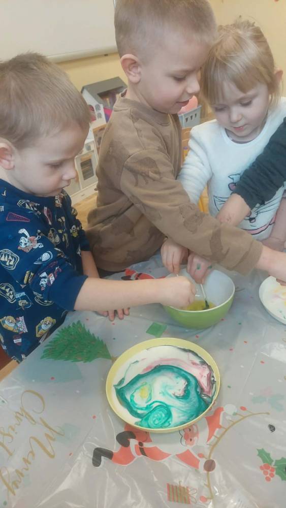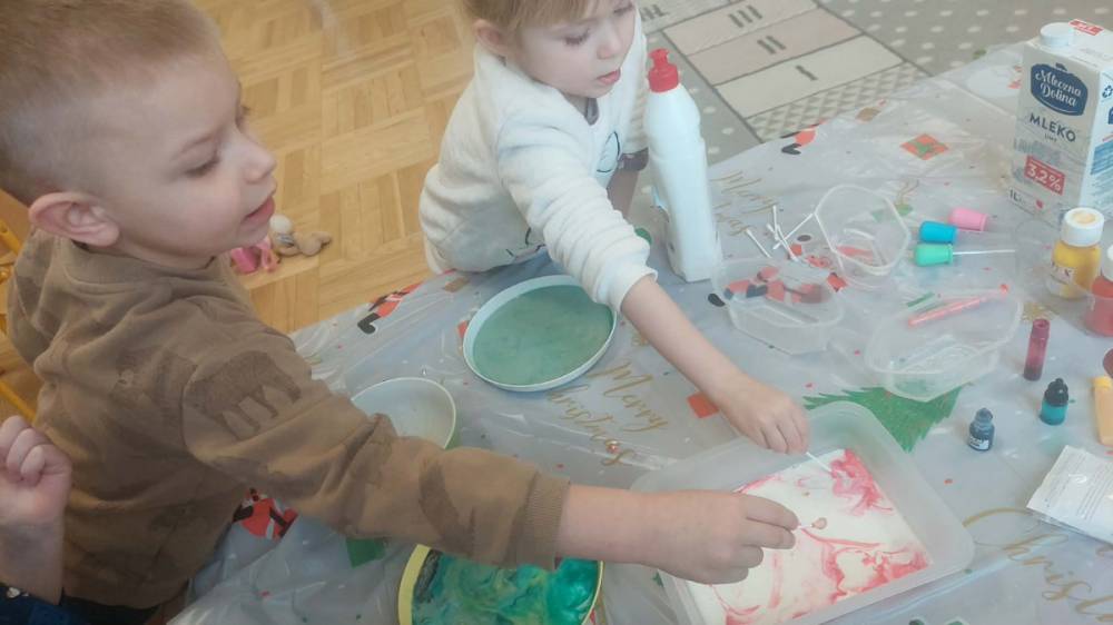 Styczeń był miesiącem, w którym nadal zajmowaliśmy się tematyką zimową. Dzieci dowiedziały się, że pasta do zębów nie służy jedynie do ich mycia, ale można dzięki niej tworzyć fantastyczne zimowe obrazy. Z pianki do golenia wykonaliśmy śnieżne bałwany, a przy użyciu lodu próbowaliśmy malować rysunki na kartce. Największym zainteresowaniem cieszyło się samodzielne wykonanie piasku kinetycznego z naturalnych składników.
