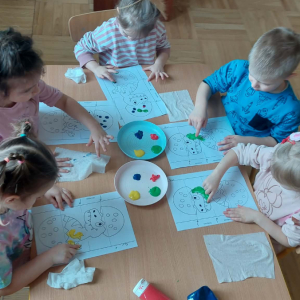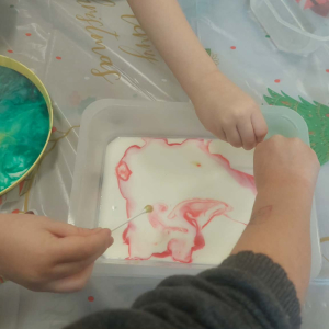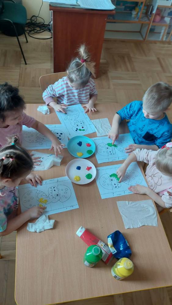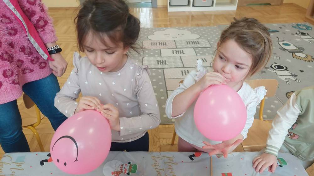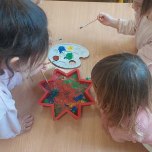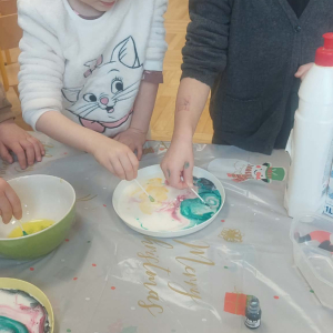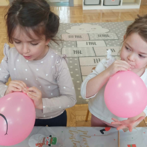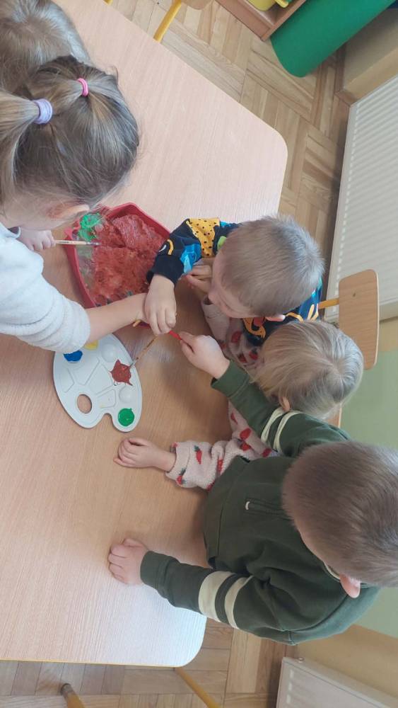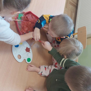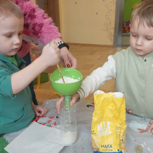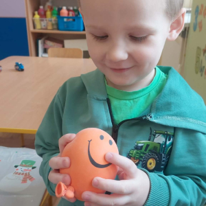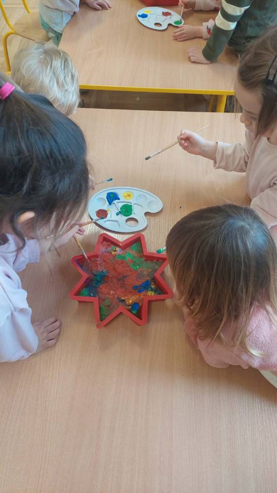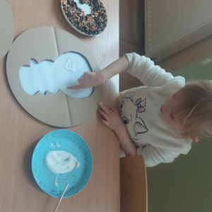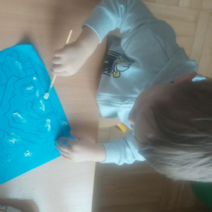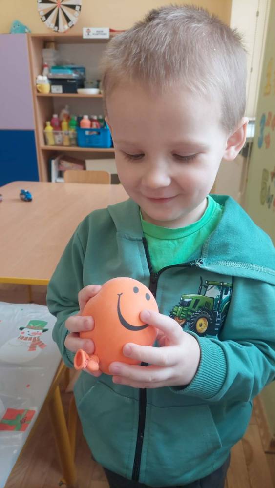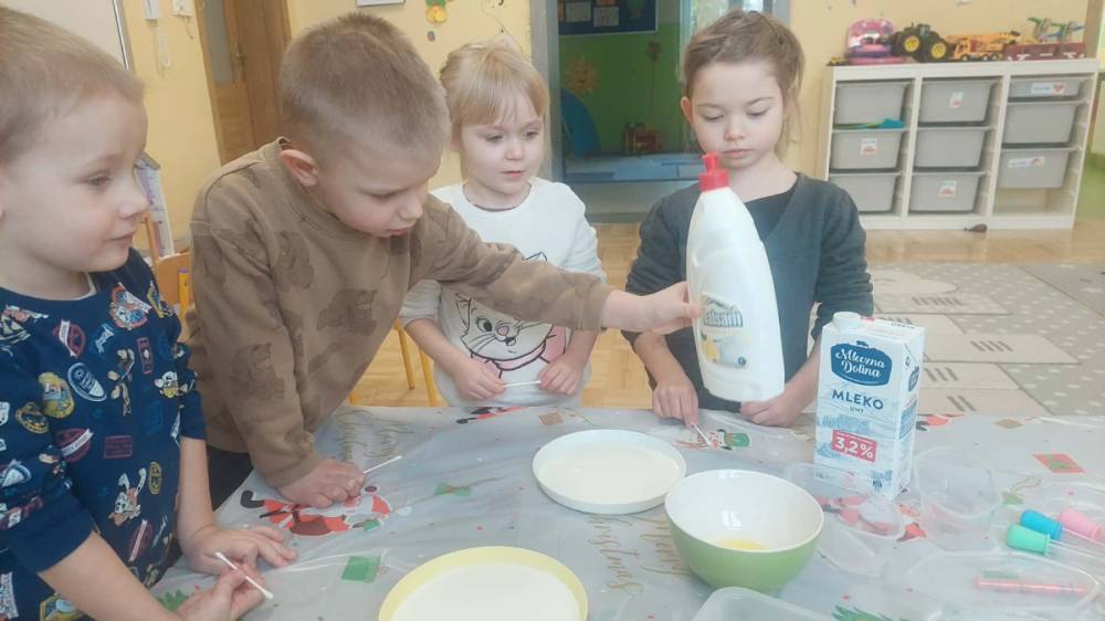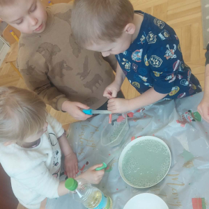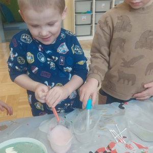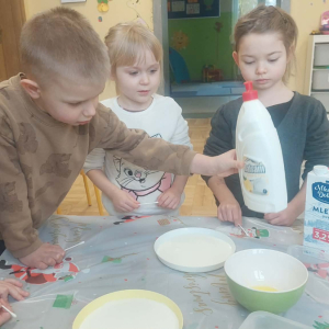 W lutym pani Gosia przygotowała dla nas kolorowe galaretki, które tym razem nie służyły do jedzenia, lecz do wąchania, ugniatania, krojenia i mieszania. Eksperymentowaliśmy również z mlekiem i barwnikami spożywczymi. Przelewaliśmy wodę do różnych pojemników przy pomocy pęsety, aby usprawniać chwyt pęsetowy. Wykonaliśmy także sensoryczne gniotki z mąki i balonów.