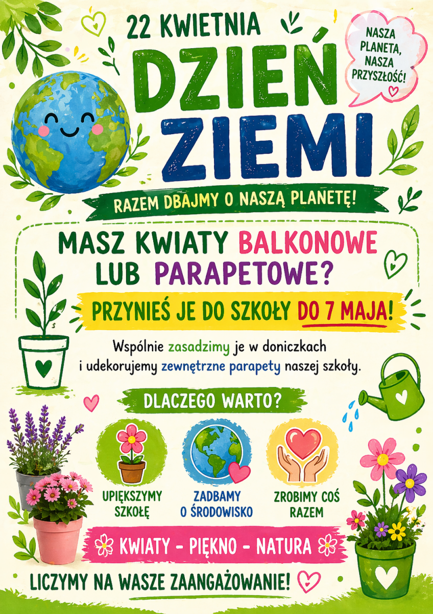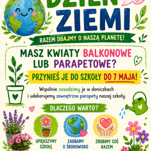Z okazji Dnia Ziemi zapraszamy wszystkich uczniów do wzięcia udziału w wyjątkowej akcji upiększania naszej szkoły! Akcja polega na przyniesieniu kwiatów balkonowych, które ożywią zewnętrzne parapety naszej szkoły i wprowadzą więcej zieleni do naszego otoczenia. Pokażmy razem, że troska o środowisko zaczyna się od małych, codziennych działań.