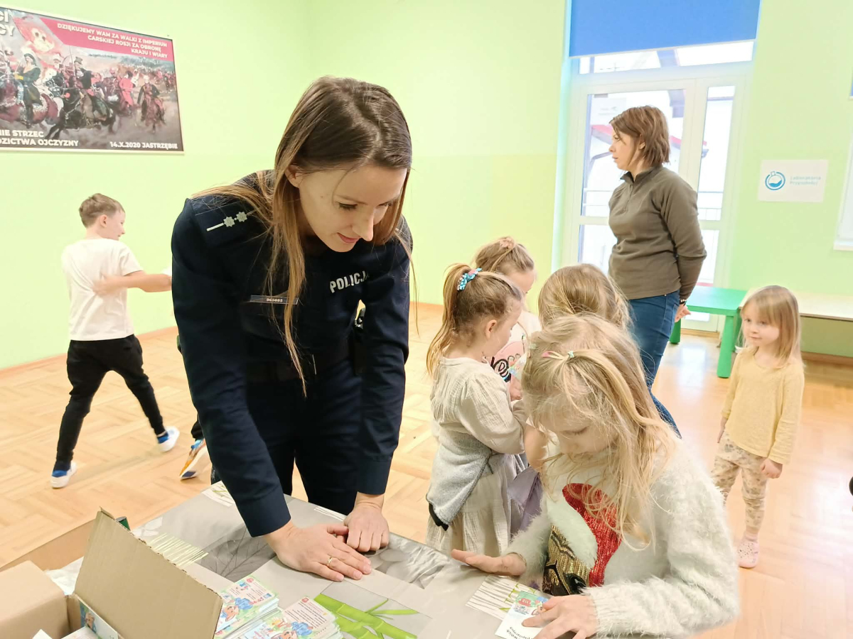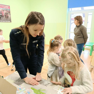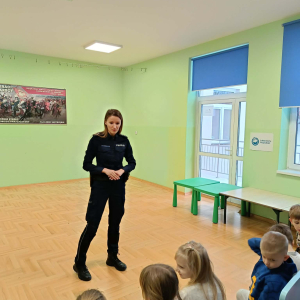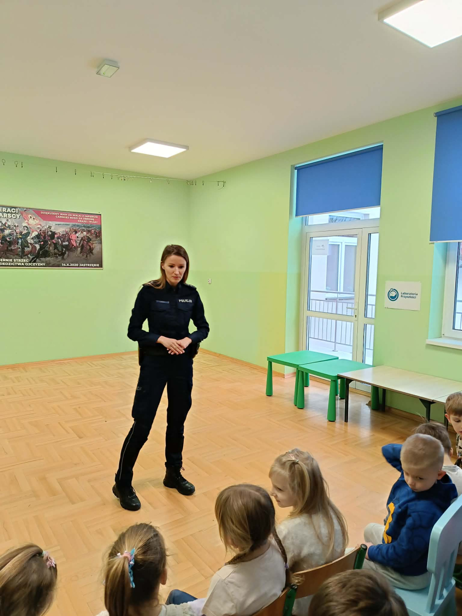 Podczas spotkania pani policjant omówiła zasady bezpiecznej zabawy na śniegu, zwracając szczególną uwagę na korzystanie z sanek, nart i łyżew. Dzieci dowiedziały się, gdzie można bezpiecznie jeździć na sankach oraz dlaczego należy unikać zjeżdżania w pobliżu ulic i zbiorników wodnych. Poruszony został również temat zimowych zabaw, takich jak rzucanie śnieżkami. Pani policjant przypomniała, że nawet podczas beztroskiej zabawy trzeba uważać, aby nie zrobić krzywdy sobie ani innym. Ważnym elementem spotkania była rozmowa o bezpiecznym poruszaniu się po drogach zimą. Dzieci przypomniały sobie zasady przechodzenia przez jezdnię oraz dowiedziały się, jak dużą rolę odgrywają elementy odblaskowe, które zwiększają widoczność pieszych po zmroku.