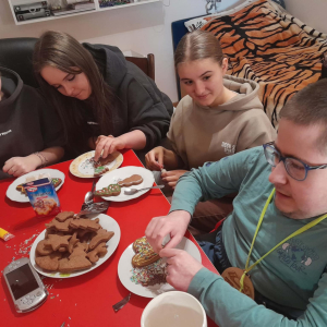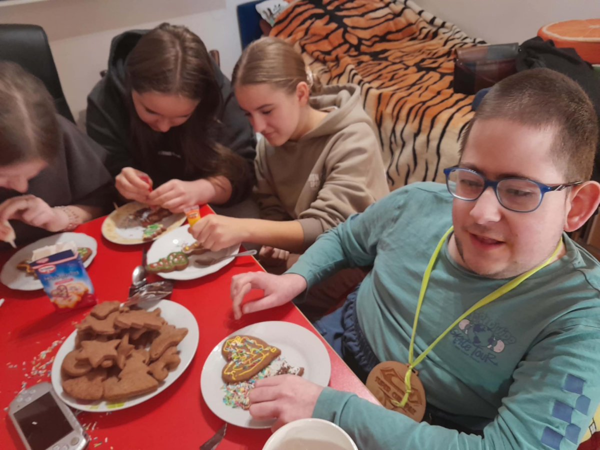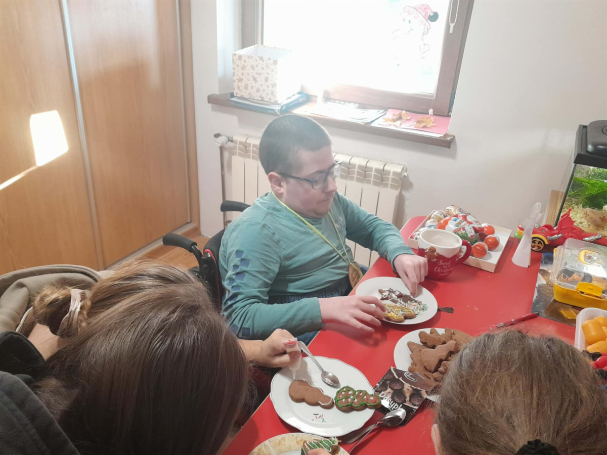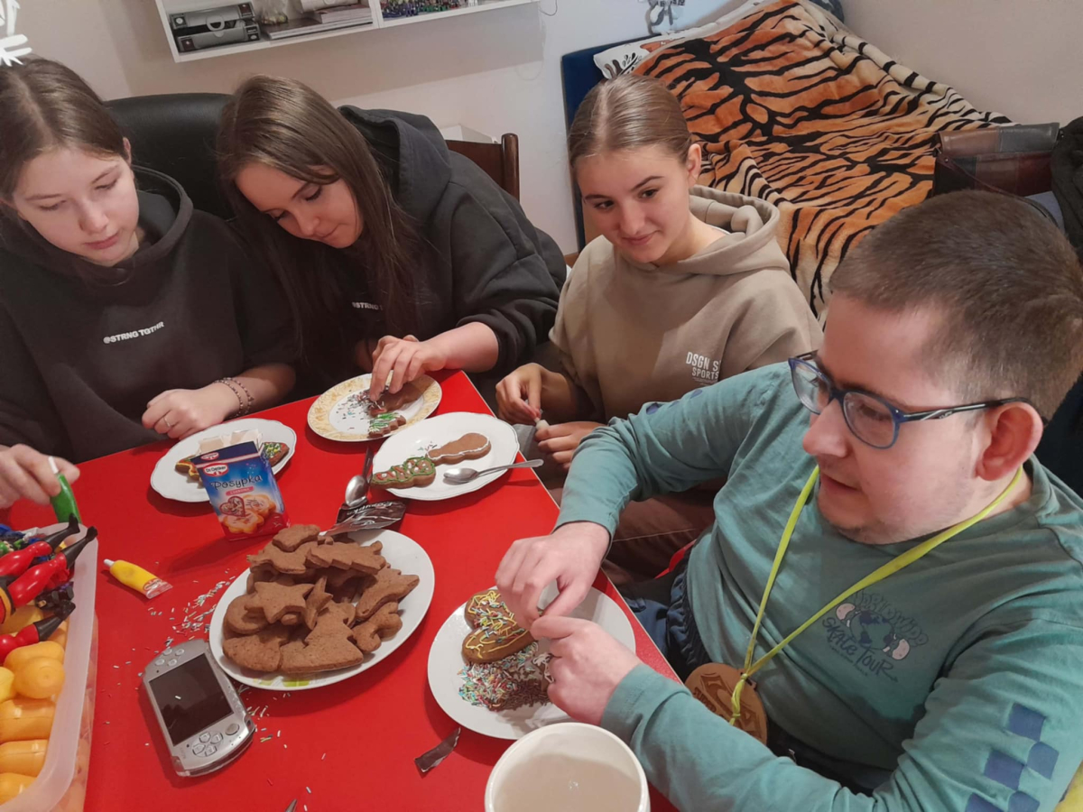 W ramach szkolnych i klasowych mikołajek pojechaliśmy w odwiedziny do Rafała Kozieła, ucznia naszej szkoły. Uczennice klasy VIII przywiozły dla niego piękny prezent - podarunek od całej klasy. Następnie wspólnie dekorowaliśmy pyszne pierniczki upieczone dzień wcześniej przez Rafała i Panią Ewelinę.