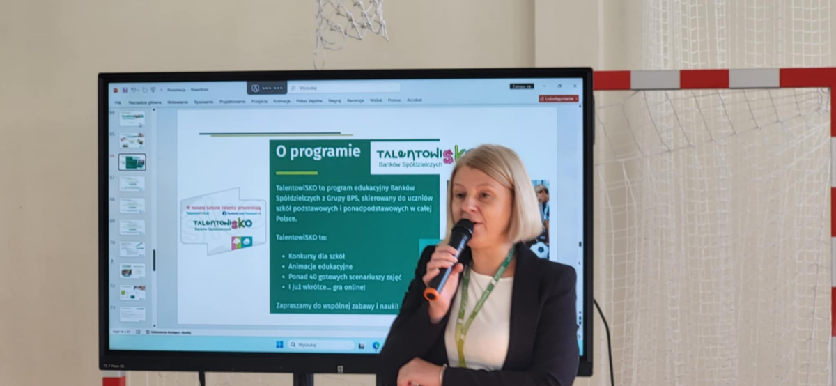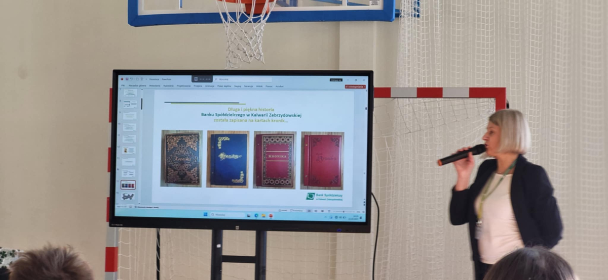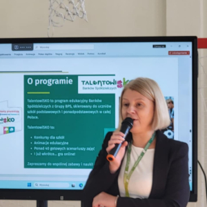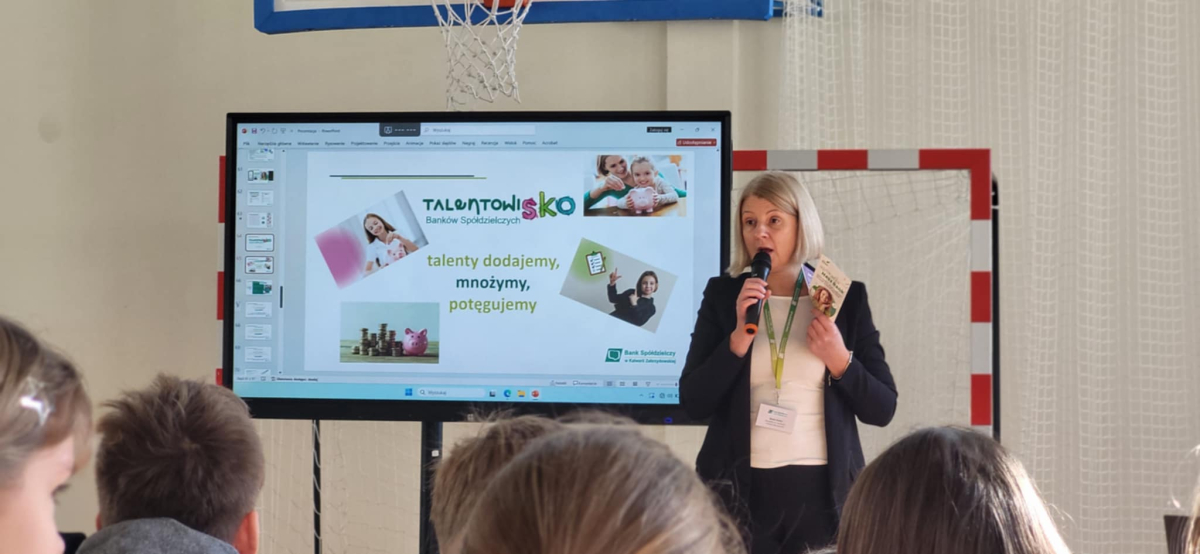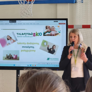 Uczniowie klas I–VIII naszej szkoły uczestniczyli w spotkaniu z pracownikami Banku Spółdzielczego w Kalwarii Zebrzydowskiej. Wizyta gości odbyła się w ramach działań edukacyjnych z zakresu finansów, przedsiębiorczości oraz programu „TalentowiSKO”, którego celem jest rozwijanie wśród dzieci i młodzieży postaw zaradności i gospodarności. Podczas spotkania panie w interesujący sposób opowiedziały uczniom o historii Banku Spółdzielczego, jego lokalnych korzeniach i znaczeniu dla społeczności Kalwarii Zebrzydowskiej i okolic. Uczniowie mieli okazję obejrzeć kronikę banku, przedstawiającą jego rozwój na przestrzeni lat oraz liczne działania społeczne, w które instytucja się angażuje.