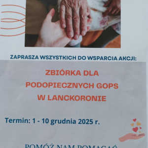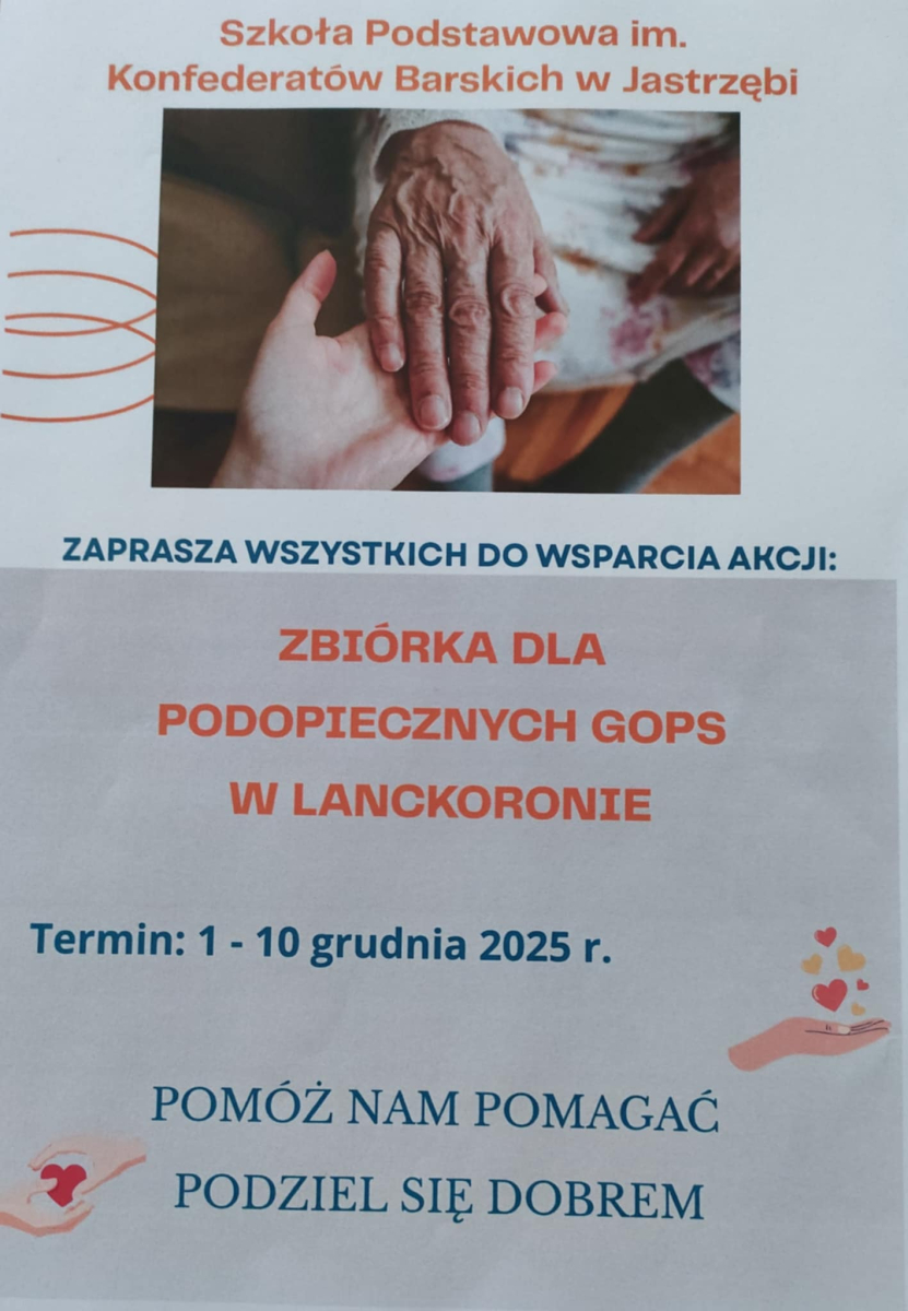 Nasza szkoła organizuje zbiórkę darów dla podopiecznych Gminnego Ośrodka Pomocy Społecznej w Lanckoronie. Zachęcamy uczniów, rodziców oraz całą społeczność szkolną do wsparcia akcji. Każda klasa przynosi inny rodzaj produktów, aby uniknąć powtórek i wspólnie zebrać wszystko, co najbardziej potrzebne. Zbiórka trwa do 10 grudnia.